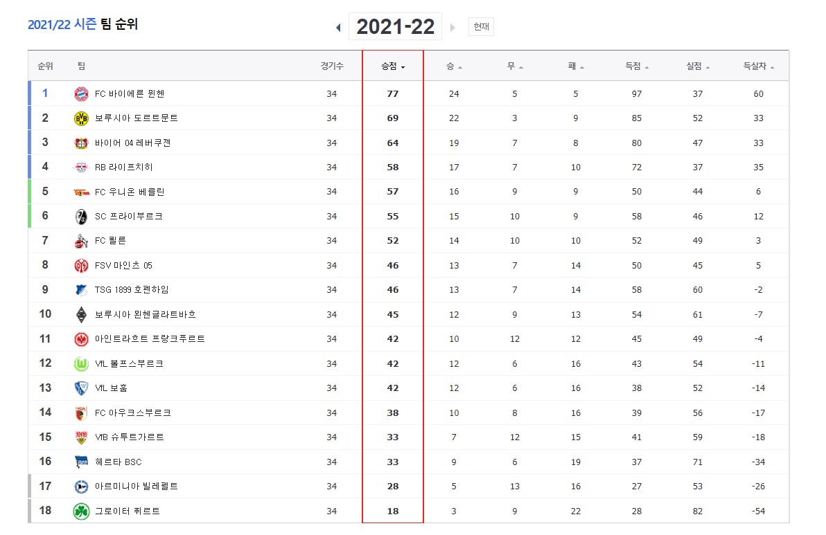 제가 이번에 크롤링 해볼 것은 네이버의 해외축구 팀순위 테이블입니다. 그중에서도 저는 분데스리가의 바이에른 뮌헨 팬이라 분데스리가 팀순위를 크롤링 해 이를 데이터 프레임에 저장해 표출해 보도록 하겠습니다. 이를 위해서는 크롤링을 진행하기 전에 컬럼이 들어가 있는 데이터 프레임을 만들어야 하는데요. 우선 네이버 분데스리가 팀순위 테이를 보시죠.
