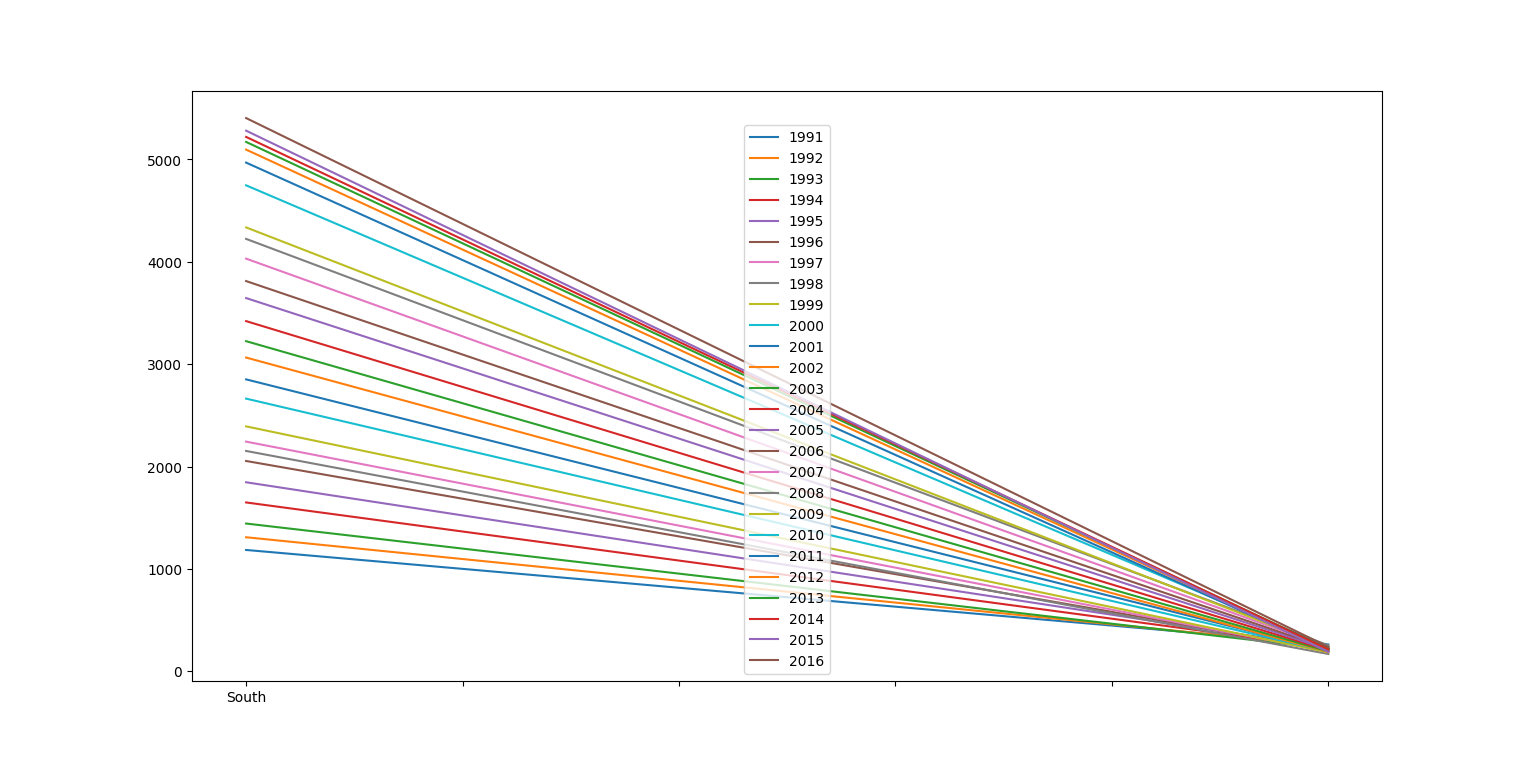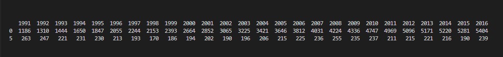 이럴 때는 어떻게 해야 할까요? 우선 인덱스처럼 특정 번호만 두개만 필요한 것이 아닌 1991부터 2016까지의 "범위"가 필요합니다. 판다스에서 특정 항목의 범위가 필요할 때는 " : " 를 활용해 슬라이싱을 합니다. 지금 우리는 컬럼 번호 3번부터 끝까지가 필요하니 마지막 범위는 정할 필요가 없습니다. 그래서 이럴 땐 " 3 : " 으로 표현하면 됩니다. 그렇다면 df.iloc는 df.iloc[[0,5],3:] 가 됩니다. 그러면 지금까지의 코딩과 결과를 보겠습니다.