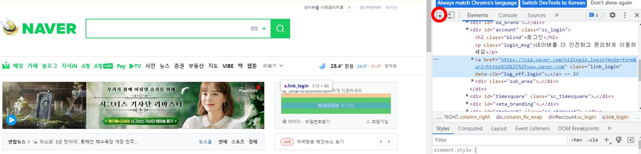 네이버 메인페이지를 연동했으니 로그인 버튼을 클릭할 코드를 짜야 겠죠. 지난 분데스리가 순위 테이블을 크롤링 했던 방식과 동일하게 마우스 우클릭 후 검사 항목을 클립니다. 그러면 현재 페이지의 html 구조가 보이는데요. 여기서 빨간색 동그라미로 표시한 화살표를 클릭하고 "NAVER 로그인" 버튼을 클릭하면 해당 부분의 구조가 보입니다. 이부분을 우클릭 후 "copy → copy selector"를 통해 태그를 긁어옵니다.