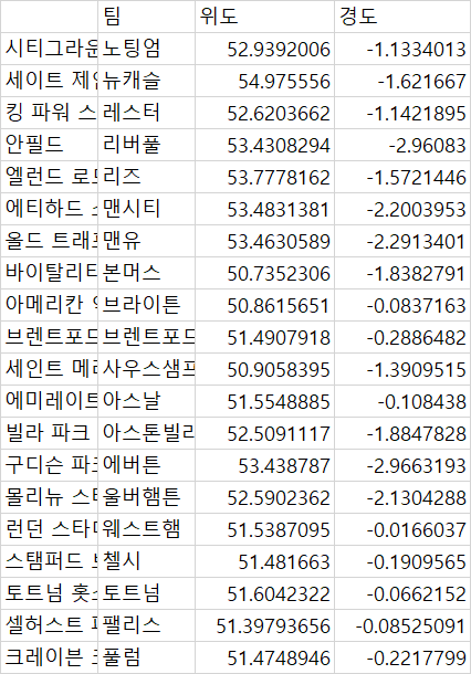 네 이렇게 잉글랜드의 지도를 불러왔는데요. 지도를 만들기 위해서는 위도와 경도가 필요합니다. 위도와 경도는 구글어스를 통해 얻을 수 있고요. 구조를 보면 folium.Map(location=[위도, 경도], zoom_start= 시작화면 줌 크기) 입니다. 네 이제 그럼 20개 구단의 홈구장을 마킹해야 하는 데요. 이를 하기 위해서는 20개 구장의 이름과 위도, 경도가 필요합니다. 저는 데이터프레임으로 반복문을 돌려 마킹을 완성할 것이기 때문에 구글 어스를 통해 20개 구장의 이름과 위도, 경도를 모두 모아 놓았고 데이터프레임화 시켰습니다. 그렇다면 이를 가지고 반복문을 어떻게 돌려야 할까요? 다음 코드 결과를 보고 풀이를 해보겠습니다.