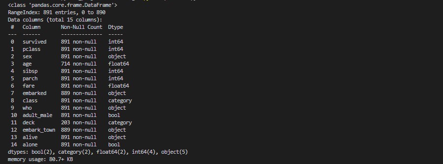 이렇게 df 옆에 .head()를 붙여 상단 5줄의 데이터만 확인해봤는데요. deck 컬럼을 보시면 누락 데이터에 "NaN"이라고 돼 있는 것을 확인할 수 있습니다. 하지만 이것만으로는 각각의 컬럼에 누락 데이터가 얼마나 있는지 알수가 없습니다. 이럴 때는 info() 매소드를 통해서 간접적으로 누락데이터가 얼마나 있는지 확인해볼 수 있습니다.