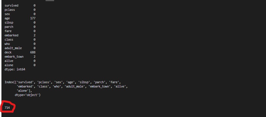 네 이렇게 891개의 행중 177개가 삭제된 714개의 행이 출력됐습니다. 다음 시간에는 이렇게 결측치가 삭제된 데이터를 가지고 그래프를 그려보도록 하겠습니다.