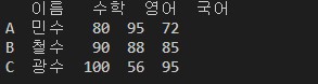 exam_data = {'이름': ['민수', '철수', '광수'],