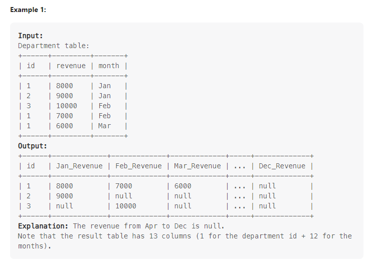 month = 'Jan'일 때를 조건으로 쿼리를 짜보았는데요. 문제의 Output과 비슷한 구조를 보이고 있습니다. 조건문의 구조를 좀 더 설명해보자면 month가 Jan일 때 revenue를 결과물로 도출하고 예외의 경우 NULL로 처리하는 것으로 하고 이를 합산하는 것으로 처리했습니다. 그렇기 때문에 Jan이 없는 id =3은 null로 나온 것을 확인할 수 있습니다. 하지만 결과물은 12월까지 이기에 1월 처럼 12줄을 만들면 되겠습니다.