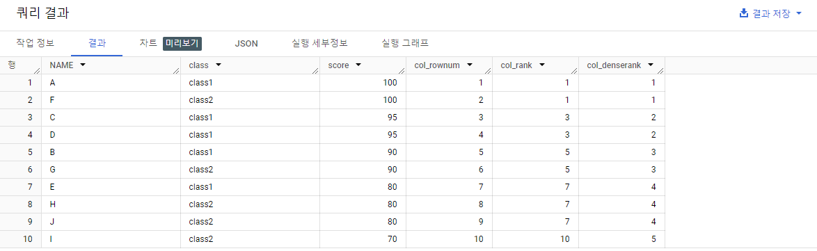 위에처럼 class 구분 없이 전체로 순위를 매겨봤다 그렇다면 class1, class2별 학급 석차는 어떻게 매겨야할까? 이때 PARTITION BY를 통해 추가 구분 조건을 넣어 학급별 석차 결과를 도출할 수 있다.